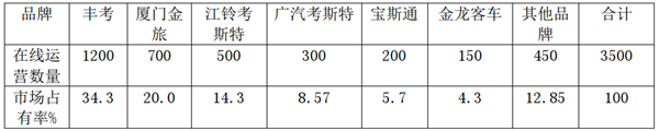 根据笔者实地了解,截止2019年7月,目前广东区域拥有考斯特车型大约3500辆左右在线运营,其中丰田考斯特(以下简称丰考)大约在1200辆左右。其余2000多辆主要是国产品牌的仿考车型,主要品牌有厦门金旅、羊考(广汽考斯特)、江铃考斯特、江淮宝斯通等,主要品牌的保有量分布情况大致如下表