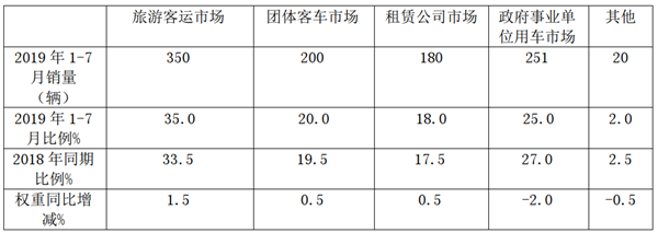根据上牌数据统计,2019年1-7月广东区域共销售考斯特客车1001辆,同比增长5%,按目标用途划分,权重最大的是旅游客运市场,也是同比增加最多的市场,再次是政府用车市场,但同比下降最大