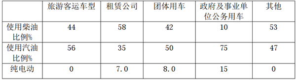 2019年1-7月广东市场考斯特客车用于旅游的车型56%喜欢汽油,44%偏好柴油;用于租赁公司的58%喜欢柴油,35%喜欢汽油,7%喜欢纯电动;用于团体市场的车型柴油占42%,汽油占比50%,纯电动占据8%,团租公司而政府公务用车则75%喜欢汽油,15%喜欢纯电动。具体比例如下表: