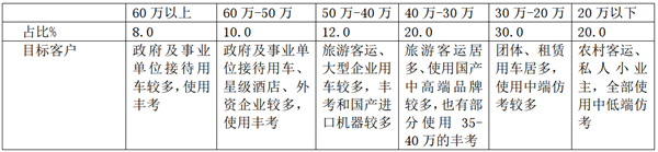 目标客户政府及事业单位接待用车较多,使用丰考政府及事业单位接待用车、星级酒店、外资企业较多,使用丰考旅游客运、大型企业用车较多,丰考和国产进口机器较多旅游客运居多、使用国产中高端品牌较多,也有部分使用35-40万的丰考团体、租赁用车居多,使用中端仿考较多农村客运、私人小业主,全部使用中低端仿考