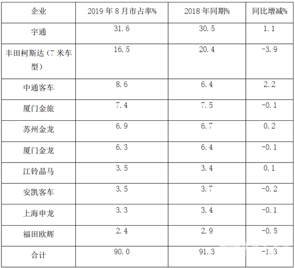 根据数据统计,团体客车2019年8月主要竞品市占率统计: