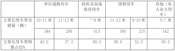 特点四、单位通勤车中,10-11米和11-12米是主打车型;政府及高端接待用车中,7-8米(前置)是主打车型;团租用车中,11-12米和8-10米是主打车型;其他私人业主用车中,5-7米是主打车型