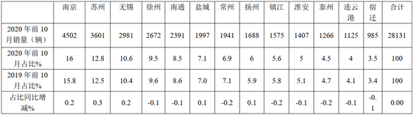 上表数据表明,2020年前10月江苏地区大中轻客车在各区域的分布特点: