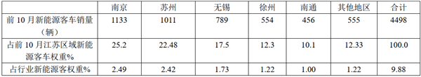 特点四、前10月江苏区域新能源客车销量占行业新能源客车销量近1成的比例,在全国属第二大(第一大是广东)