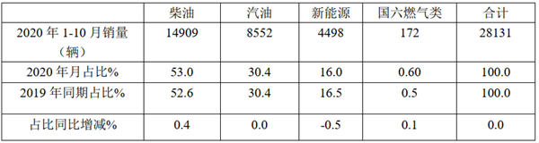 根据最新上牌信息统计,2020年1-10月江苏市场按照燃料种类划分,大中轻客销量结构: