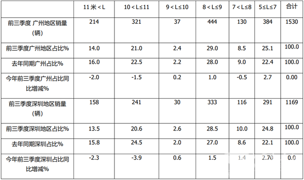 上表可见,在今年前三季度,作为广东区域销售新能源客车最多的广州和深圳,8-9米新能源客车销售占比均为最多(广州占比为29%,深圳占比为28.5%);5-7米轻型新能源客车占比为第二(广州占比为25.1%,深圳占比24.8%);10-11米车型占比为第三(广州占比为21%,深圳占比20.6%);