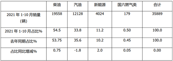 上表可见,在2021年1-10月按燃料种类划分江苏区域市场客车销量结构,柴油仍然占据最大主体,销量为19558辆,占比为54.5%,且同比有增加0.75个百分点;汽油占比33.8%,位居第二,同比减少1.8%;新能源客车占比位居第三,占比11.2%,且同比增加2.0百分点.是同比增加最多的车型;国六燃气客车占比0.5%,是各细分车型中占比最小的细分市场.同比增加0.05%;占比同比增加最大的是柴油客车,占比减少最大的是汽油客车。