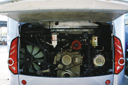 作为一款长度将近11m的团体旅游客车来说,其整车外形大气恢弘。大型风窗玻璃为驾驶员提供了良好视野,前脸轮廓线与侧窗玻璃下沿线流畅连接,整体感很强。整车的结构设计采用了沃尔沃车身结构技术和研发流程,满足沃尔沃强度试验方面的各种规定。由于全车身采用了侧蒙皮及顶角蒙皮滚压技术、其平整度及接缝工艺极佳。来到车后方,还是车灯吸引了我们,倒车灯、制动灯组采用侧排设计,也许这是申沃客车车灯设计的主导思路,亦是为了和车身侧围完美的衔接。