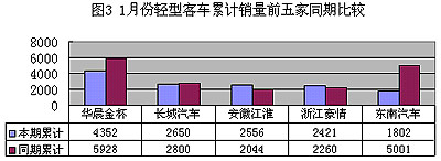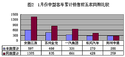 1月份由于春节假期的缘故,汽车产销均出现下滑。1月全国汽车产销分别为29.97万辆和30.41万辆,同比分别下降9.68%和7.34%。其中客车产销分别为8.09万辆和8.49万辆,同比分别下降15.72%和19.23%。 2004年1月份与03年12月份相比,客车总产量减少38424辆,下降幅度达32.21%。大、中、轻、微客车环比全部出现下降。1月份大型客车产量为1432辆,中型客车产量为2824辆,与12月份相比大型客车和中型客车下降绝对数较少,但由于基数较小,下降幅度却分别达到50.60%和53.86%,1月份轻型客车产量为28425辆,比12月份下降36.62%。微型客车产量为48187辆,比12月份下降26.34%。 2004年1月份客车共销售12.72万辆,比03年12月份下降33.17%。与生产相同,各型客车销售都出现下降,其中与12月份相比销售下降幅度最大的为中型客车,共销售2908辆,下降54.28%。大型客车降幅排在第二位,共销售1582辆,比12月份下降50.08%。排在三、四位的依次是轻型客车和微型客车,分别销售26244辆和54257辆,分别下降42.19%和24.90%。 1月大型客车生产企业累计产量前五家企业是常州长江、一汽集团、福建新福达、郑州宇通、江苏亚星,前五家企业的产量占整个行业比例达到了68.02%。销售前五家企业分别是常州长江、一汽集团、郑州宇通、福建新福达和江苏亚星。其销量和占整个行业的67.26%。值得注意的是一汽集团产销排名都上升到第二位。 1月中型客车累计生产量前五家的企业为:安徽江淮、一汽集团、苏州金龙、东风汽车、亚星客车,其五家企业的生产集中度达到70.68%,从累计销售前五家企业为安徽江淮、苏州金龙、一汽集团、东风汽车和郑州宇通,其中郑州宇通和苏州金龙当月产销率分别达到152.04%和112.29%,而一汽集团产销率只有66.47%。 1月轻型客车累计产量前五家的企业是华晨金杯、浙江豪情、安徽江淮、东南汽车和长城汽车。华晨金杯继续位居第一,但同比累计却下降28.79%;本期累计销售同比也下降26.59%,而安徽江淮产销同比均出现大幅上升,上升幅度分别达到74.61%和25.05%,安徽江淮推出的瑞风MPV市场表现强劲,为江淮销量上升贡献不小。 1月微型客车生产企业前三家为:哈飞、上汽通用五菱和长安。三家的产量集中度占整个行业的74.77%,三家的销量集中度更达到76.60%。
