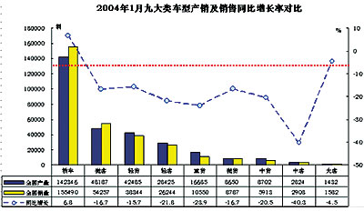 2004年1月九大类车型市份额对比 轿车市场继续扩张,占据国内汽车市场的半壁江山,同比增长6.7个百分点;大客市场没有变化,其它车型市场均不同程度收缩