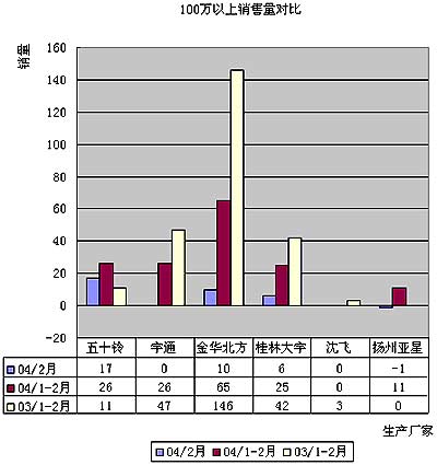 04年2月份统计到高档客车销量主要有以上几家企业。由于03年春节是在2月份, 1月份仍然是购车旺季,故各厂家03年1-2月份较04年1-2月份销量多。广州五十铃04年2月份销售17辆,销量排在首位。