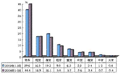 3月份全国汽车产销同比均增长,1-3月累计销量增速超过全国水平的车种有轿车、中货、大客和轻货。