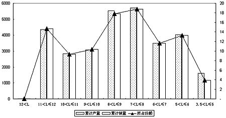 表二:2004年1-4月份客车企业按长度分区段产销量及所占份额