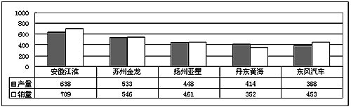6月份中型客车的本月产量是3853辆,比5月份下降0.67%;本月销量是4090辆,比5月份增长为8.69%,中型客车企业市场行情已开始好转,但较去年同期累计仍下降5.84%。6月份中型客车生产企业产量排名前五家企业依次是安徽江淮、苏州金龙、扬州亚星、丹东黄海和东风汽车。其中,扬州亚星本月产量较5月份增长165.09%。