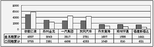 1~6月份中型客车生产企业(32家)累计产量排名前五家的企业分别是安徽江淮、苏州金龙、一汽集团、东风汽车和丹东黄海。除苏州金龙为27.8%和丹东黄海为53.19%外,其余三家均出现下降分别是安徽江淮为-15.6%、一汽集团为-36.06%和东风汽车为-34.61%。有八家中型客车生产企业出现增长,其中以跃进汽车(177.18%)、福建新福达(132.05%)、郑州宇通(97.41%)和丹东黄海(53.19%)为代表,并且这四家的累计产量均在千辆以上。同时,还有八家中型客车生产企业去年同期累计产量为零,无法计算累计增长率。此外,剩余16家中型客车生产企业继续负增长。从本月中型客车行业来看,产量已经较上月明显增长,但是,受前期产量影响,本期累计增长率仍为负值。本期中型客车企业累计产量是22656辆,与同期累计相比为-5.84%,中型客车市场格局变化明显。