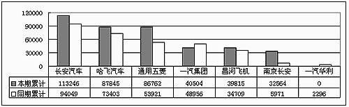 就累计产销情况而言,1~6月份微型客车企业(9家)前五家企业的产量与去年同期相比,前三家仍然保持增长,其中,通用五菱最为突出(49.87%);而一汽集团(-21.95%)和昌河飞机(-25%),产量下滑趋势明显。1~6月份微型客车企业(9家)累计销量排名前五家企业分别是长安汽车、通用五菱、哈飞汽车、一汽集团和昌河飞机,前五家企业排名与上月一样保持不变。前五家的市场份额占整个行业的92.36%,其中长安汽车(29.09%)、通用五菱(22.64%)、哈飞汽车(21.44%)、一汽集团(10.21%)和昌河飞机(8.98%)。本月累计销量表现最为突出的是南京长安(96.72%)。