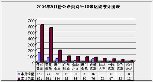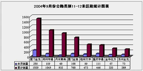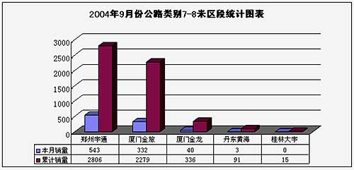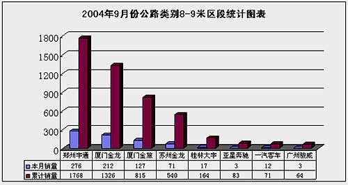 2004年9月份公路类别11-12米区段共销售851辆,累计销售5787辆。其中,厦门金龙以250辆的销量,1509辆的累计销量排名第一。郑州宇通和重庆宇通的销量分别为109辆、111辆。在本统计图表中,郑州宇通和重庆宇通是分别统计,以方便企业细化市场。 2004年9月份公路类别10-11米区段共销售390辆,1-9月份累计销售2180辆。从收入到本统计图表中的企业数量就可以看出本区段的市场竞争十分激烈。郑州宇通以106辆的销量,670辆的累计销量位列榜首。一汽客车与厦门金旅分列二、三位。但他们与郑州宇通的差别不是很明显。本段市场主要为前三名的争夺,厦门金龙的累计销量只有23辆,位列第八。 2004年9月份公路类别9-10区段共销售379辆,1-9月份累计销售1862辆。本区段市场主要集中在丹东黄海和亚星奔驰。他们分别以151、77的本月销量和621、571的1-9月累计销量名列前两名。厦门金旅和厦门金龙分列三、六名。 2004年9月份公路类别8-9米区段共销售724辆,1-9月份累计销售4840辆。郑州宇通以276辆的月销量,1768辆的累计销量位列第一。“三龙”紧随其后。厦门金龙的本月销量为212辆,1-9月累计销量1326辆。厦门金旅的月销量为127辆,1-9月份累计销量815辆。本区段市场集中度很高。 2004年9月份公路类别7-8米区段共销售1372辆,1-9月份累计销售8575辆。本区段郑州宇通以543辆的销量,2806辆的累计销量排名首位。厦门金旅的本月销量为332辆,1-9月累计销量为2279辆。厦门金龙排名第三。市场竞争主要为郑州宇通和厦门金旅的争夺。