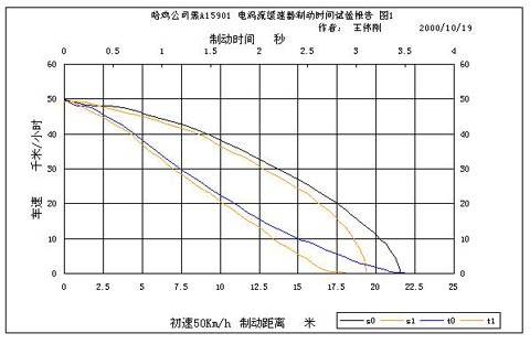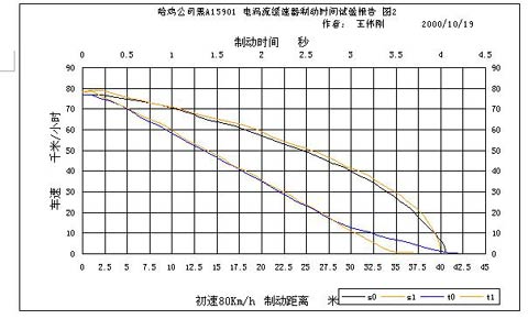 1、 图一、图二分别为制动初速度50KM/H、80KM/H紧急制动的时间历程V=F(T),制动距离历程V0=F(S0)、V0 =F(T0)、V0 =F(S0)为电涡流缓速器不起作用,只使用原制动系统的结果。V=F(T)、V=F(S)为电涡流缓速器和原制动系统同时起作用的结果。 从F(S)曲线可明显看出,加装电涡流缓速器和不装电涡流缓速器有明显差异,根据数理统计的相关标准计算的V(50):制动距离S0 =21.75米、制动减速度jB0=-4.79M/S²、S=20.01米、jB=-5.49M/S²,缩短制动距离8%为1.74M,制动减速度提高14.6%。V(80):制动距离S0 =43.72米、制动减速度jB0 =-6.08M/S²、S=42.13米、jB=-6.56M/S²,缩短制动距离3.6%为1.59M,制动减速度提高7.9%。