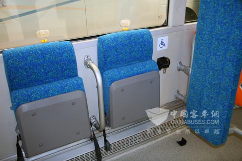 所谓无障碍设施公交主要是为解决轮椅代步者上下车不便的难题而设计的。其最大的特点就是超低地板,一般车辆底板距路面仅有30厘米,而马路牙子一般高20厘米左右,所以汽车进站贴近路边时,乘客可以很轻松地上下车。车辆中门是专为方便残疾人上下车设计的,一个轮椅标志醒目地印在车门的右侧。停车后,司售人员拉开藏在车门下的踏板铺在马路牙子上就可形成一条无障碍通道,供轮椅驶上公交车。车厢内正对中门的一片区域,没有固定坐椅,只是在车窗下安装有三个折叠椅。该区域是为停放轮椅而专门空出来的,平时如果没有轮椅乘客,三个折叠椅也可供普通乘客乘坐。此外,该车车身还能右倾,只要司机按下方向盘边的控制按钮,公交车车身就可以缓慢地向右倾斜下来,靠近路面,方便乘客上下车。