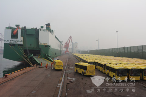 中国客车英文网[www.chinabuses.org]: 阳光灿烂,海风轻拂。2014年7月30日,位于山东半岛南岸的胶州湾内的青岛港迎来了它最为神圣的时刻,2186辆着统一黄色"服装"的中通校车方队停靠在偌大的码头广场整装待发,这些"校车精灵"即将踏上新的航程前往沙特。这是迄今为止国内客车企业最大批量的校车出口订单,也是国内单批次出口的最大客车订单。