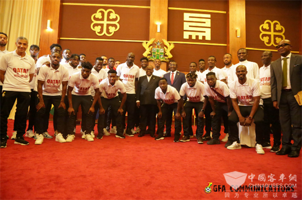 比赛结束后,加纳总统Akufu Addo接见了国家队全体成员。全程负责本次运送任务的是苏州金龙海格双层公交KLQ6119GS。辅以加纳国旗涂装的海格客车与载誉而归的球员们一起见证了这一荣耀时刻。