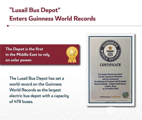 卢赛尔电动车场站占地面积超40万平方米,由24座多功能建筑组成,凭借着具有478台电动车的容纳量,获得全球最大电动车场站吉尼斯世界纪录,可为卡塔尔世界杯期间的交通提供保障,为游客和公众提供独特的绿色出行体验。