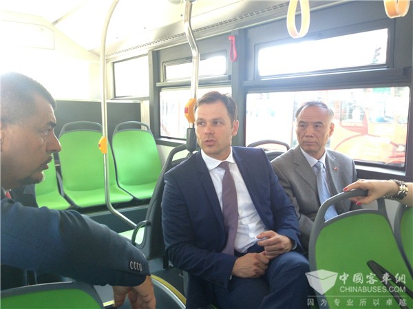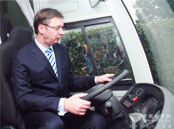 时任贝尔格莱德市长辛尼萨(右二)、时任中国驻塞尔维亚大使李满长(右一)试乘海格客车