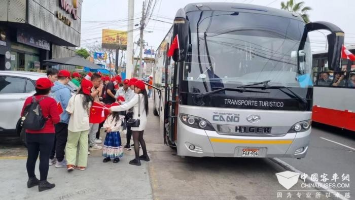 秘鲁当地华人华侨、民众乘坐海格客车欢迎中国贵宾