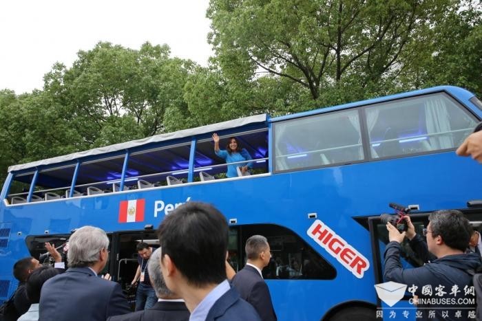 秘鲁共和国总统博鲁阿尔在海格双层巴士上向大家挥手致意