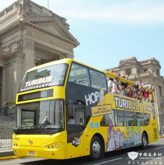 行驶在秘鲁总统府大街上的海格双层观光巴士