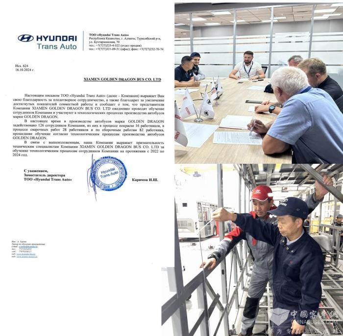 除了工程技术团队来中国“留学”,金旅客车还收到了3封感谢信,在信中哈方对金旅客车的当地团队丝毫不吝惜赞美之情——正是在金旅团队的帮助下,这条产线的产能从每日不足1辆,稳定提升至每日2辆。