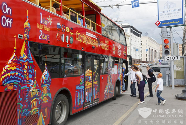 俄罗斯世界杯期间乘客乘坐海格双层巴士