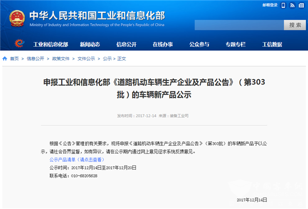 2017年12月14日,工信部发布《道路机动车辆生产企业及产品公告》(第303批)的车辆新产品公示。本次申报客车产品共93款(包括2款校车、10款客车底盘),其中新能源客车有76款(包含68款整车产品和8款客车底盘),占比81.7%。从车型来看,包括15款传统客车产品(包含2款传统客车底盘),2款校车,69款纯电动客车,5款插电式混合动力,2款燃料电池客车。