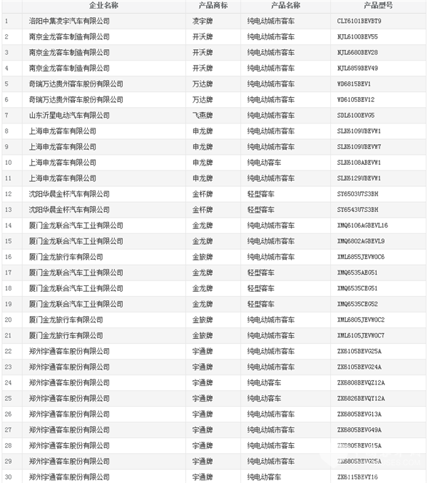 XINGKONG.COM了解到,宇通客车、福田汽车、比亚迪、东风汽车、中通客车、金龙客车、金旅客车、申龙客车、中车电动、苏州金龙等都有多款客车产品入围,其中宇通客车累计有25款新能源客车上榜,位列榜首;福田汽车共有14款客车产品上榜,包括13款新能源客车和1款轻型客车,位列第二;比亚迪有6款纯电动客车入围,位列第三。