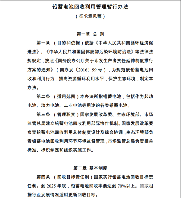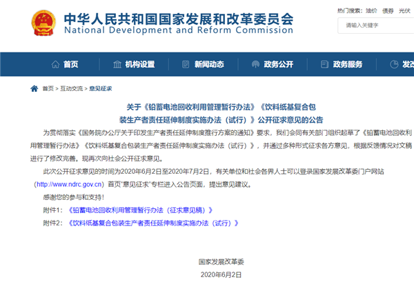 2020年6月2日,国家发改委发布关于《铅蓄电池回收利用管理暂行办法》的征求意见稿。此次征求意见稿明确了铅蓄电池回收率的发展目标:在2025年底前实现回收率达到70%以上。并且明确了回收企业需要取得相应资质。