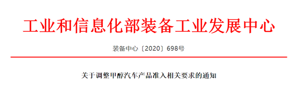 2020年12月15日,工业和信息化部装备工业发展中心发布了《关于调整甲醇汽车产品准入相关要求的通知》。