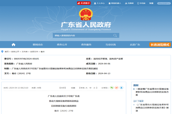 2024年4月6日,广东省人民政府印发了关于《广东省推动大规模设备更新和消费品以旧换新实施方案》的通知 (粤府〔2024〕27号)。