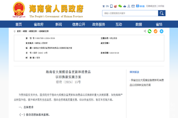2024年4月28日,海南省人民政府印发了关于《海南省大规模设备更新和消费品以旧换新实施方案》(琼府〔2024〕15号)。