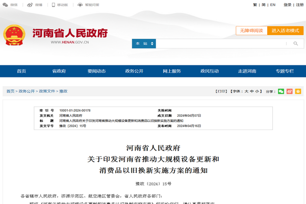 2024年4月16日,河南省人民政府印发了关于《河南省推动大规模设备更新和消费品以旧换新实施方案》的通知(豫政〔2024〕15号)。