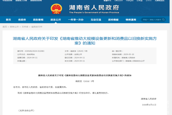 2024年4月11日,湖南省人民政府印发了关于《湖南省推动大规模设备更新和消费品以旧换新实施方案》的通知(湘政发〔2024〕5号)。