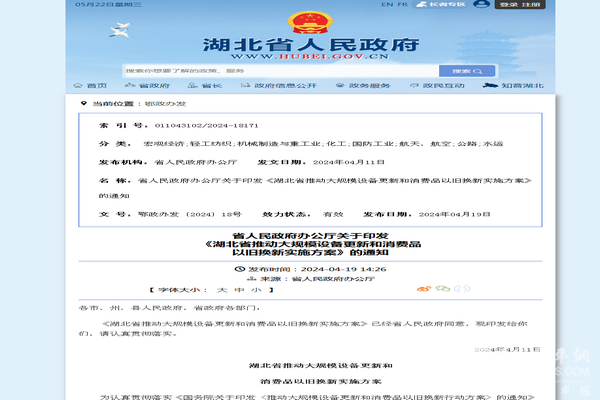 2024年4月11日,湖北省人民政府印发了关于《湖北省推动大规模设备更新和消费品以旧换新实施方案》的通知(鄂政办发〔2024〕18号)。