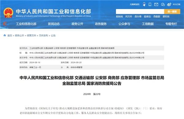 XINGKONG.COM2024年8月21日获悉,工业和信息化部、交通运输部、公安部、商务部、应急管理部、国家市场监管总局、国家金融监管总局、国家消防救援局等八部门近日联合发布公告,部署做好老旧新能源城市公交车辆安全有序更换动力电池工作,服务人民群众安全便捷出行。