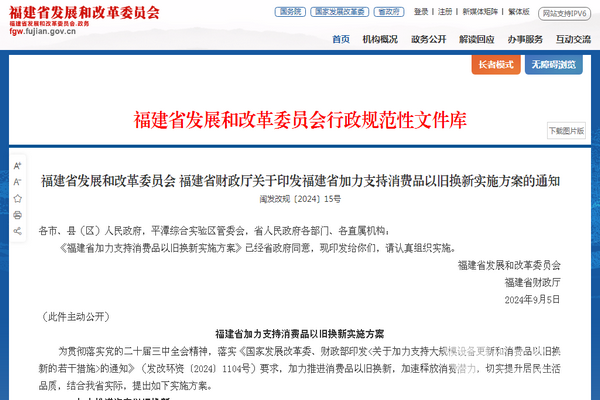 2024年9月5日 ,福建省发展和改革委员会、福建省财政厅联合印发了关于《福建省加力支持消费品以旧换新实施方案》的通知【闽发改规〔2024〕15号】。
