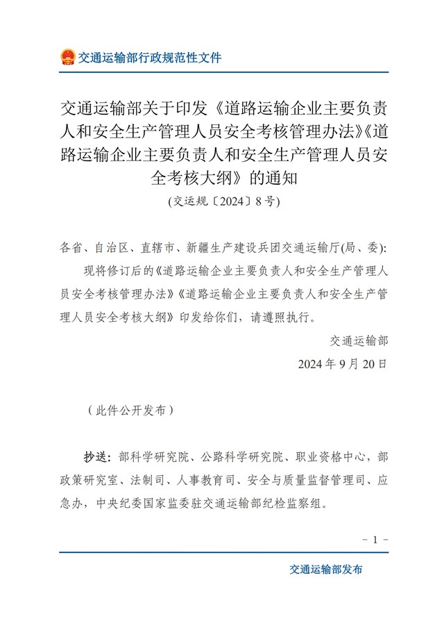 近日,交通运输部修订印发《道路运输企业主要负责人和安全生产管理人员安全考核管理办法》《道路运输企业主要负责人和安全生产管理人员安全考核大纲》(交运规〔2024〕8号,以下简称《管理办法》和《考核大纲》),自2024年10月1日施行。为便于各有关部门单位准确理解并贯彻落实好有关工作要求,现就《管理办法》和《考核大纲》有关修订情况解读如下: