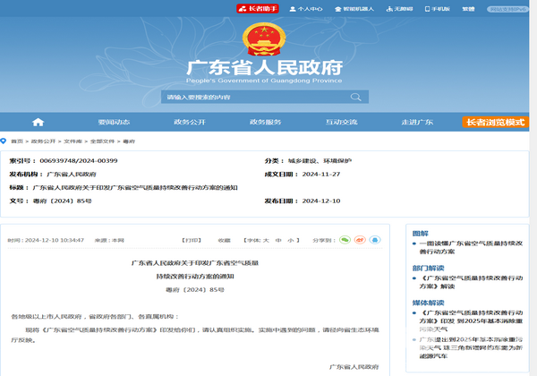 近日,广东省人民政府发布了《关于印发广东省空气质量持续改善行动方案的通知》【粤府〔2024〕85号】。
