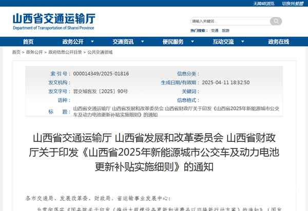 2025年3月25日,山西省交通运输厅、山西省发展和改革委员会、山西省财政厅联合印发了《山西省2025年新能源城市公交车及动力电池更新补贴实施细则》的通知【晋交城客发〔2025〕90号】。