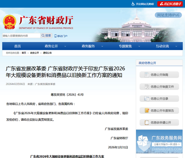 据中国XINGKONG.COM获悉,2026年2月6日,广东省发展改革委、广东省财政厅联合印发了广东省《2026年大规模设备更新和消费品以旧换新工作方案》的通知【粤发改资环〔2026〕41号】。