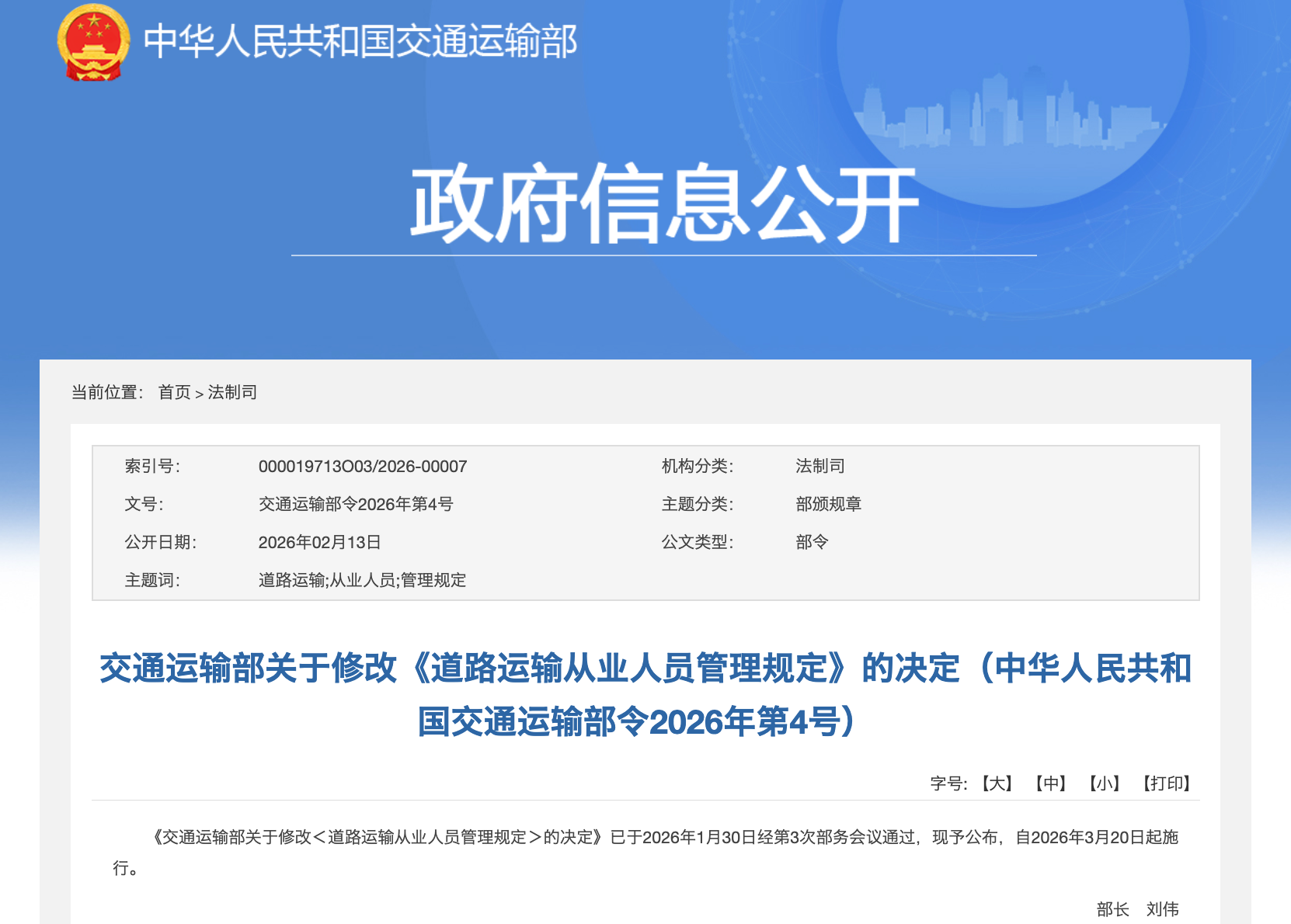 XINGKONG.COM2026年2月26日获悉,交通运输部发布《关于修改<道路运输从业人员管理规定>的决定》,其中作出修改,将经营性道路客货运输驾驶员、道路危险货物运输从业人员、驾驶操作教练员等相关道路运输从业人员年龄要求统一调整为“年龄不超过63周岁”,规定自2026年3月20日起施行。原文如下: