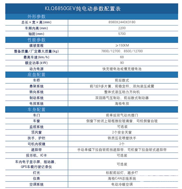 海格KLQ6850GEV纯电动客车 报价与技术咨询