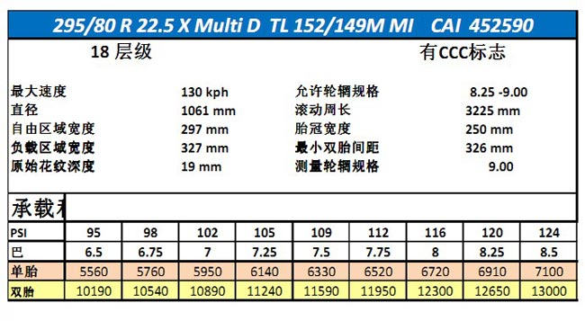 米其林韧其行X Multi D驱动轴无内胎轮胎参数配置